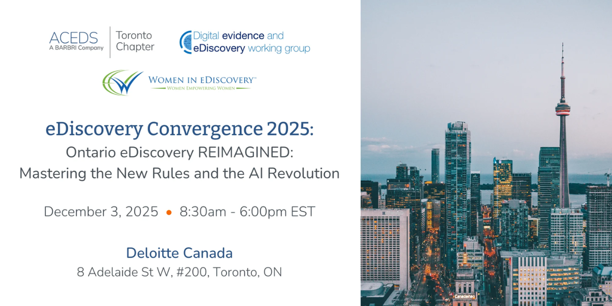 « All Events This event has passed. eDiscovery Convergence 2025 December 3 @ 8:30 am - 5:00 pm « The Production of Electronically Stored Information Guidelines and Protocol Add to calendar Google Calendar iCalendar Outlook 365 Outlook Live Details Date: December 3 Time: 8:30 am - 5:00 pm Website: https://ediscovery.aceds.org/ediscovery-convergence-2025